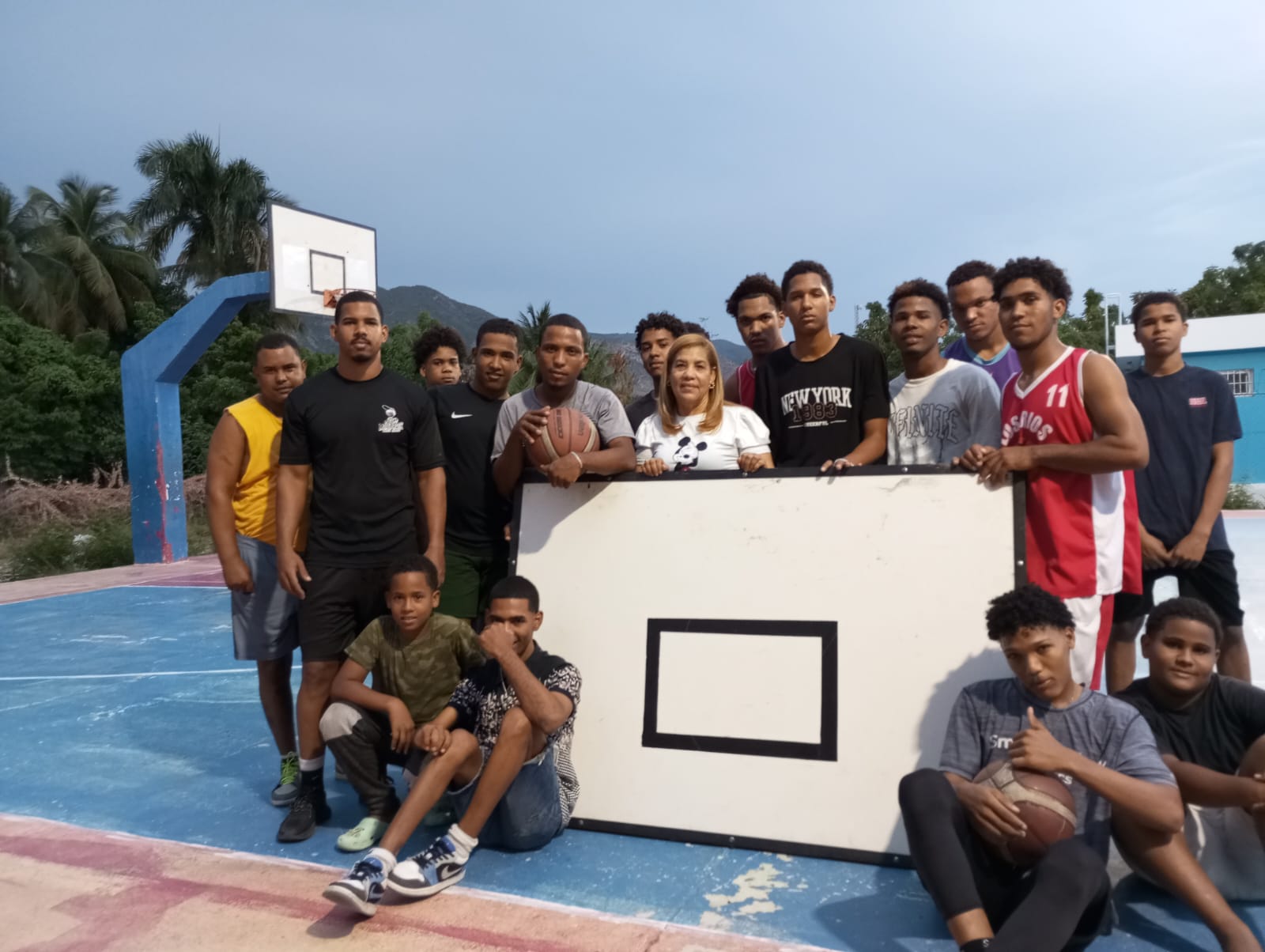 LOS RIOS, Bahoruco. – En un gesto de apoyo y como una muestra más del cumplimiento de su compromiso con la juventud y las buenas causas sociales del municipio de los Ríos, la alcaldesa Marta Cueva, hizo entrega de dos tableros con sus respectivas mayas, a las canchas de los sectores Hato Nuevo y El Faro respectivamente.
