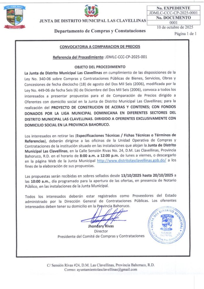 La Junta de Distrito Las Clavellinas en cumplimiento de las disposiciones de la Ley No. 340-06 sobre compras y Contrataciones Públicas de Bienes, Servicios, Obras y Concesiones de fecha dieciocho (18) de agosto del dos mil seis (2006), modificada por la Ley No. 449-06 de fecha seis (06) de diciembre del dos mil seis (2006), 𝘾𝙊𝙉𝙑𝙊𝘾𝘼 a todos los interesados a presentar propuestas para el proceso de Comparación de Precios para la realización del PROYECTO DE CONSTRUCCIÓN DE ACERAS Y CONTENES; CON FONDOS DONADOS POR LA LIGA MUNICIPAL DOMINICANA EN EL DISTRITO MUNICIPAL LAS CLAVELLINAS, DIRIGIDO A OFERENTES EXCLUSIVAMENTE CON DOMICILIO SOCIAL EN LA PROVINCIA BAHORUCO