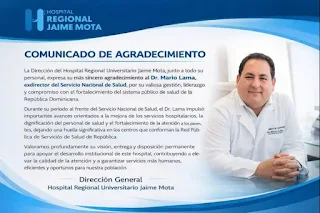 Con este comunicado, el Hospital Regional Universitario Jaime Mota reconoce y valora el impacto positivo de la gestión del Dr. Mario Lama en la salud pública dominicana.