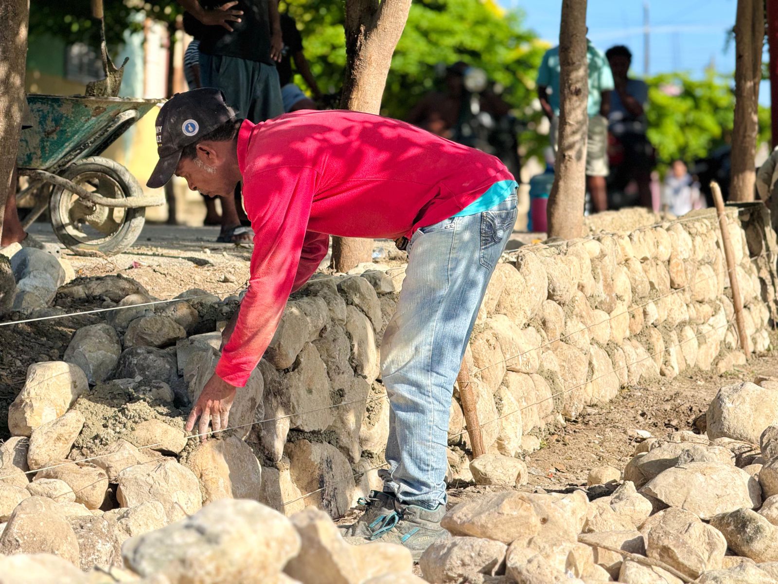 Además de la construcción de Aceras y Contenes en sectores que no cuentan con este tipo de estructuras y que garantizan ser tomados en cuenta en futuros programas de asfalto por parte del Ministerio de Obras Públicas, MOPC, Rivas, dijo, que se construye un muro de gaviones mamposteado, para lograr el nivel del espacio de construcción de estas obras.