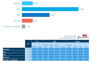 El estudio, levantado el 16 y 18 de mayo de 2025 a nivel nacional, también muestra que el 66.3% de los encuestados considera que Abinader ha sido un buen Presidente y el 64.8% lo califica entre sobresaliente y satisfactorio.